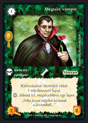 Kiadás: Tükördimenzió Gyakoriság: ritka Lapszín (isten): Sheran Típus: szörny Altípus: vámpír Szöveg: Kijátszásakor ellenfeled eldob 1 véletlenszerű lapot. 1_VP, áldozd fel: megakadályoz egy lapot. Illusztráció: Ruzsinszki Zsolt