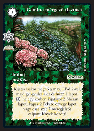 Szöveg: Kijátszásakor megnő a max. ÉP-d 2-vel, majd gyógyulsz 4-et és húzz 1 lapot! (J), ha egy körben kijátszol 2 Sheran lapot, kapsz 2 Fekete özvegy lapot vagy ossz el 7 méregjelzőt célpont lények között!