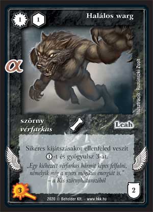 Kiadás: Alfa pakli – Vérfarkasok Gyakoriság: gyakori Lapszín (isten): Leah Típus: szörny Altípus: vérfarkas Szöveg: Sikeres kijátszásakor ellenfeled veszít 1_VP-t és gyógyulsz 3-at. Szinesítő szöveg: "Egy kiéhezett vérfarkas bármit képes felfalni, némelyik még a nyers mágikus energiát is." - a Kis szörnyhatarozóból Illusztráció: Ruzsinszki Zsolt
