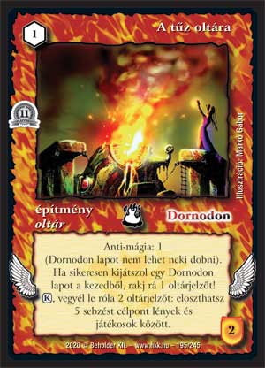 Szöveg: Anti-mágia: 1 (de Dornodon lapot nem lehet neki dobni). Ha sikeresen kijátszol egy Dornodon lapot a kezedből, rakj rá 1 oltárjelzőt! (K), vegyél le róla 2 oltárjelzőt: eloszthatsz 5 ÉP sebzést célpont lények és játékosok között.