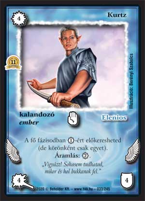 Kiadás: Alappakli, 11. kiadás Gyakoriság: ritka Lapszín (isten): Elenios Típus: kalandozó Altípus: ember Szöveg: Repül. A fő fázisodban 1_VP-ért előkeresheted (de körönként csak egyet). Áramlás: 2_VP. Szinesítő szöveg: "Vigyázz! Sohasem tudhatod, mikor és hol bukkanok fel." Illusztráció: Berényi Szabolcs