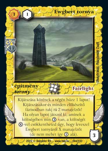 Szöveg: Kijátszása körének a végén húzz 1 lapot! Kijátszásakor és minden előkészítő fázisodban rakj rá 2 manajelzőt! Ha olyan lapot játszol ki, aminek a költségében min.3_VP van, a költségét X_VP-vel csökkentheted úgy, hogy leveszel Ewgbert tornyáról X manajelzőt (de nem mehet így 1_VP alá).